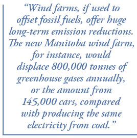 Wind farms, if used to offset fossil fuels, offer huge long-term emission reductions. The new Manitoba wind farm, for instance, would displace 800,000 tonnes of greenhouse gases annually, or the amount from 145,000 cars, compared with producing the same electricity from coal.