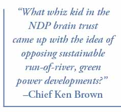 Ken Brown, chief of the Klahoose First Nation, is criticizing the New Democratic Party (NDP) for calling for a moratorium on private power projects. “What whiz kid in the NDP brain trust came up with the idea of opposing sustainable run-of-river, green power developments?” Brown asked. “Their extensive research did not include getting a first nations’ perspective on the situation or evaluating the effect of first nation votes on election night.”