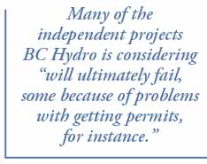 When asked, BC Hydro gamely insists that it expects all projects to go ahead. That’s true, in the sense that no one can predict whether a particular project is going to fail. But the utility could not be more clear in its written submissions to the British Columbia Utilities Commission: Many of the projects it will be negotiating will ultimately fail, some because of problems with getting permits, for instance.