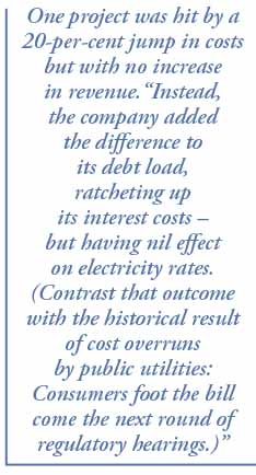 Plutonic Power has encountered those cost pressures. A project to build a 120-megawatt hydroelectric project (part of an earlier call for power bids) cost $420-million in the spring of 2006, but the price tag jumped to $497-million by the fall of 2007, close to a 20-per-cent increase. However, the revenue that Plutonic will get from the project didn’t rise at all. Instead, the company added the difference to its debt load, ratcheting up its interest costs — but having nil effect on electricity rates. (Contrast that outcome with the historical result of cost overruns by public utilities: Consumers foot the bill come the next round of regulatory hearings.)