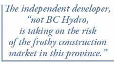 Mr. McInnes accepts all of this as the rules of the game, although he does note that BC Hydro is magnifying the risk by forcing firms to commit to bid amounts months before awarding contracts, leaving a significant lag before private firms are able to actually sign up contractors and thus have a firm command of the actual costs they will face.